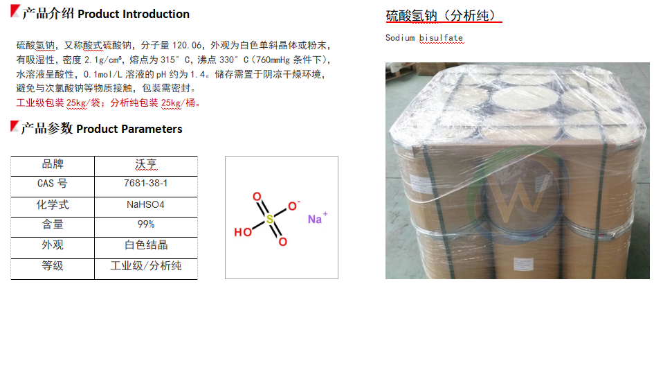 主要用作助熔剂和消毒剂,并用于制硫酸盐和钠矾等,也用作矿物分解助熔剂、酸性染料助染剂以及制取硫酸盐和钠钒等,也用于制造厕所清洁剂、除臭剂、消毒剂。