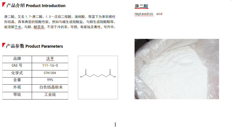 庚二酸是一种重要的有机化工原料,是合成增塑剂、润滑油、导热油、介电流体、纤维、高分子共聚体、聚丙烯成核剂、墨水、涂料树脂、表面活性剂、杀菌剂、杀虫剂、粘合剂等的原料;