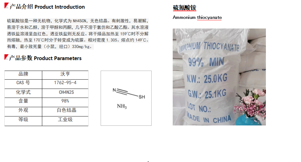 无机工业用于制造氰化物,硫氰酸盐、亚铁氰化物、硫脲和用作生产双氧水的辅助材料。有机工业用作聚合的催化剂。医药工业用于抗生素生产中合成和分离工艺。电镀工业用于镀锌。印染工业用作印染扩散剂。农药工业用于制造叶青爽等。钢铁工业用于配置浸酸剂。分析化学中用了银、汞、微量铁测定,农药含氮量分析,水质分析,配置硫氰酸根的标准溶液等。
