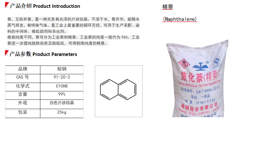 为基本化工原料,主要用于生产苯酐、各种萘酚、萘胺等,是生产合成树脂、增塑剂、橡胶防老剂、表面活性剂、合成纤维、染料、涂料、农药、医药和香料等的原料。