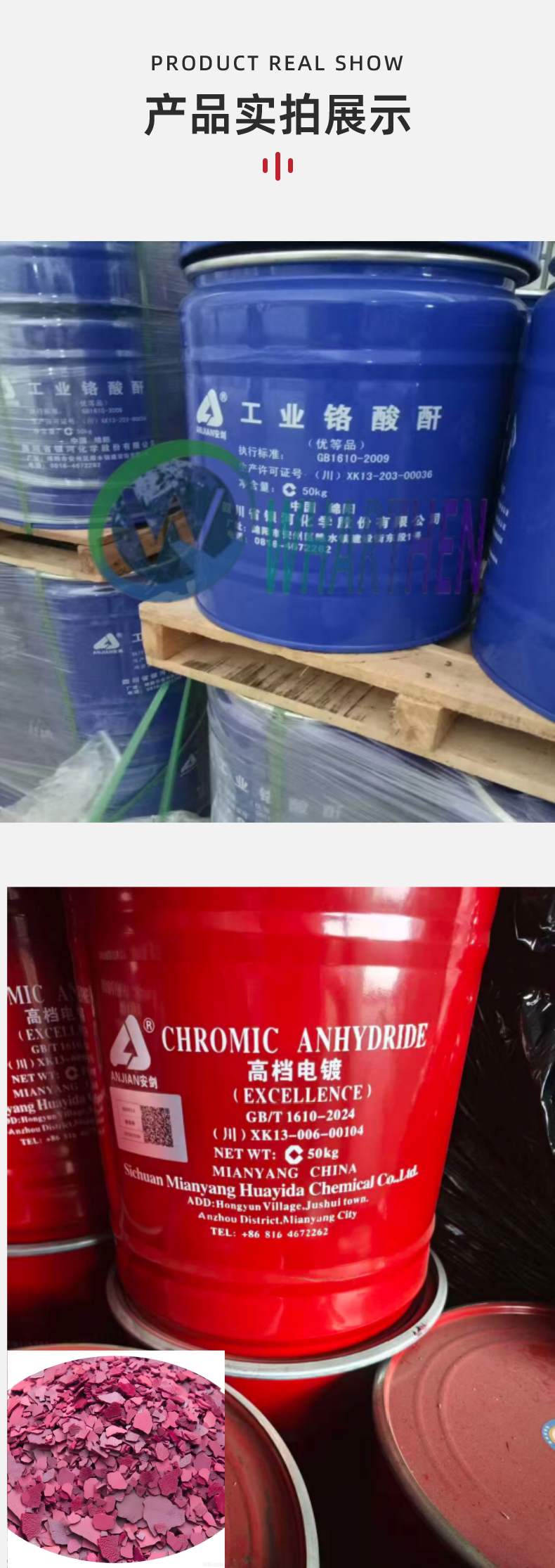 铬酐是电镀工业的重要原料,用作电镀铬的主要原料。大部分铬酐消费在电镀工业中。它是一种良好的氧化剂,可用于漂白、精制、染料、媒染剂、鞣革剂和有机合成反应的催化剂。此外,铬酐还被用在医药、陶瓷、有色玻璃等工业领域。