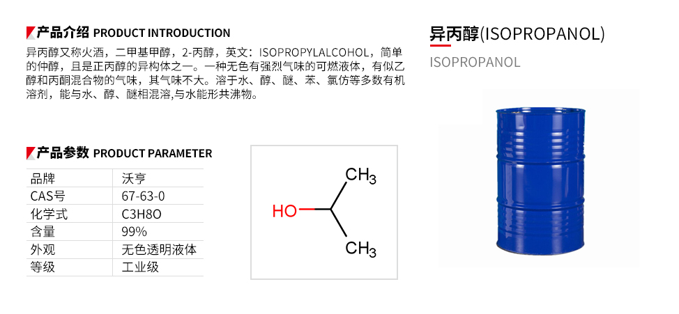 作为有机原料和溶剂有着广泛用途。作为化工原料,可生产丙酮、过氧化氢、甲基异丁基酮、二异丁基酮、异丙胺、异丙醚、异丙醇醚、异丙基氯化物,以及脂肪酸异丙酯和氯代脂肪酸异丙酯等
