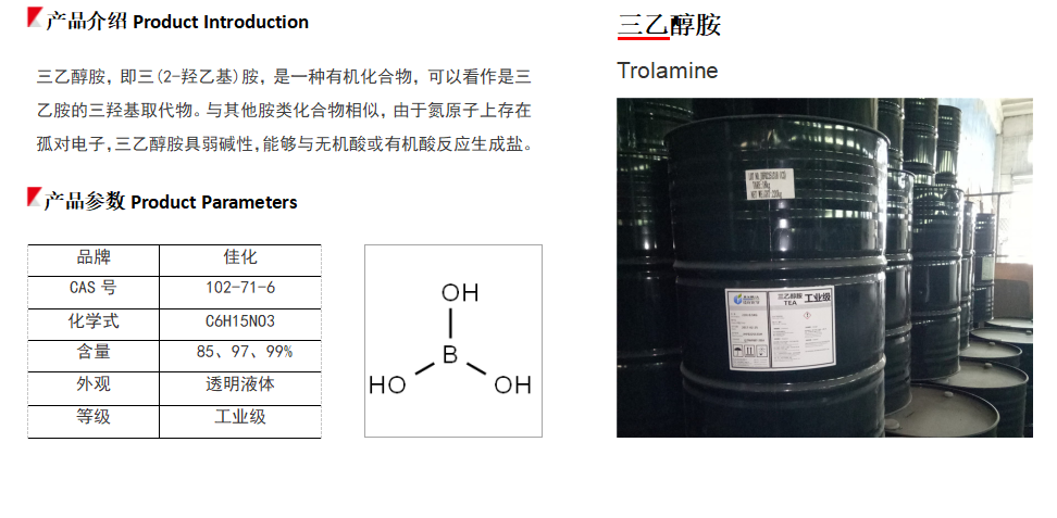三乙醇胺是一种广泛应用于各种领域的缓蚀剂组分。它用于锅炉水处理、汽车引擎冷却剂、钻井和切削油剂的生产,以及表面活性剂、纺织专用品、蜡、抛光剂、除草剂、石油破乳剂、化妆品、水泥添加剂等方面。
