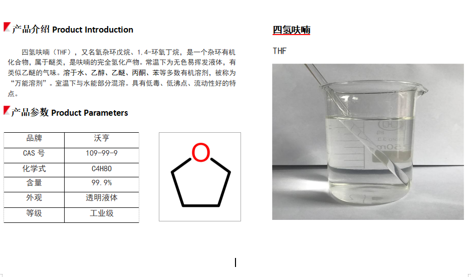 四氢呋喃是一种重要的有机合成原料和优良的溶剂,其对许多有机物的溶解性极佳。它能溶解除聚乙烯、聚丙烯及氟树脂以外的所有有机化合物,特别是对聚氯乙烯、聚偏氯乙烯和丁苯胺有良好的溶解作用,被广泛用作反应性溶剂。四氢呋喃作为常用溶剂,已普遍用于表面涂料、保护性涂料、油墨、萃取剂和人造革的表面处理。同时,它是生产聚四亚甲基醚二醇(PTMEG)的重要原料,也是制药行业的主要溶剂。用作天然和合成树脂(特别是乙烯基树脂)的溶剂,也用于制丁二烯、己二腈、己二酸、己二胺等。